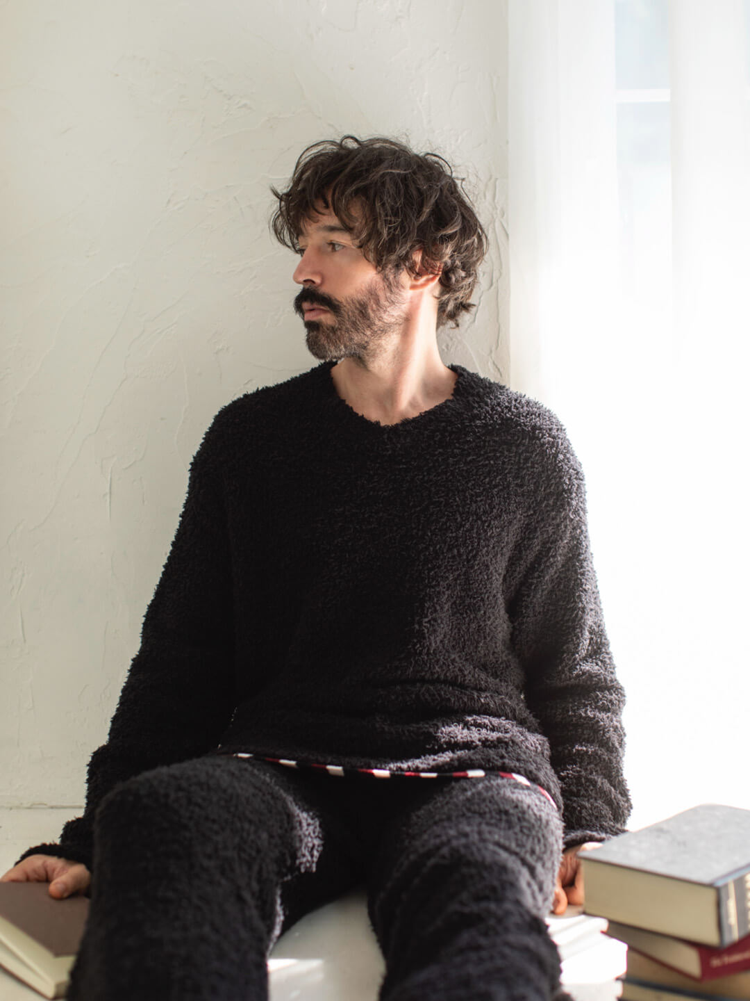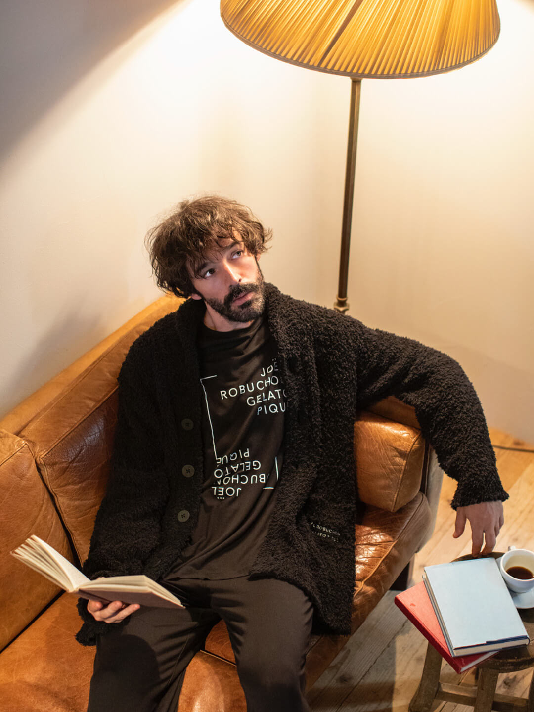 上質な肌触りと生地感は、シルクをMIXしたレーヨン素材。カットソーセットアップに、’ジェラート’素材のガウンを羽織って、ぬくもりたっぷりのスタイルに。黒を貴重としたコーディネートに、遊び心あふれるタイポグラフィがスタイリッシュなアクセントを加えてくれます。